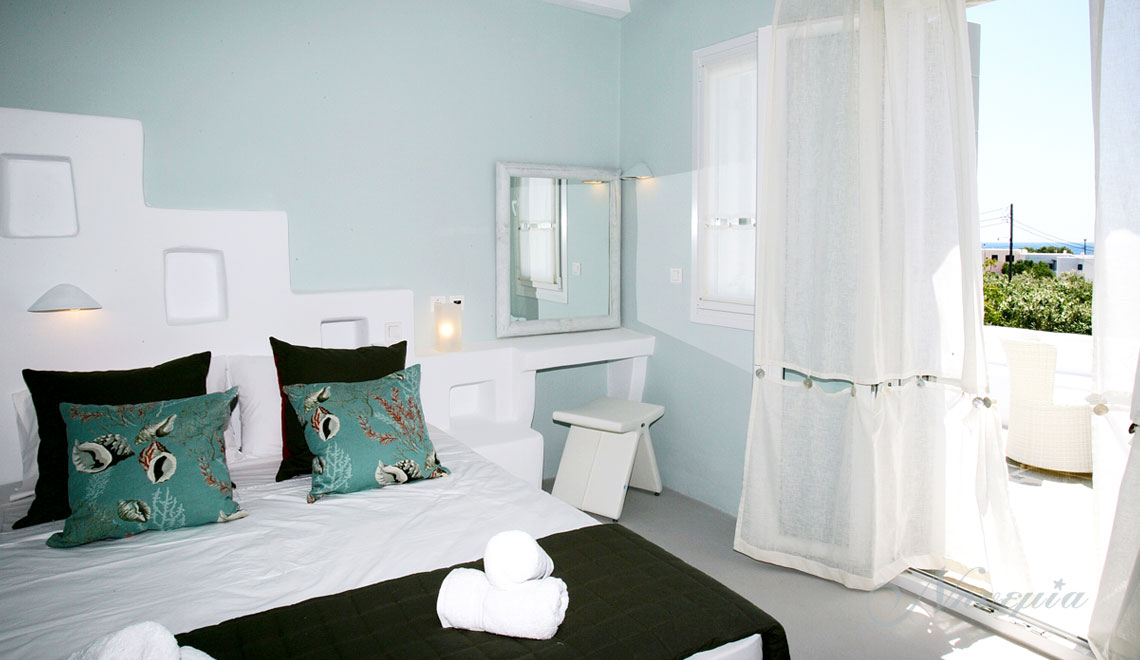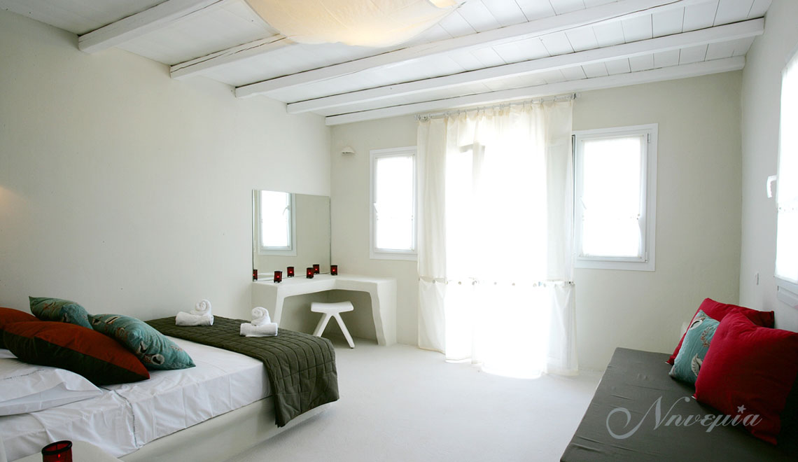 Η κρεβατοκάμαρα έχει σε όλες διπλό κτιστό κρεβάτι και στο σαλόνι διαθέτουμε ένα ή δύο καναπέδες κρεβάτια για παιδία .